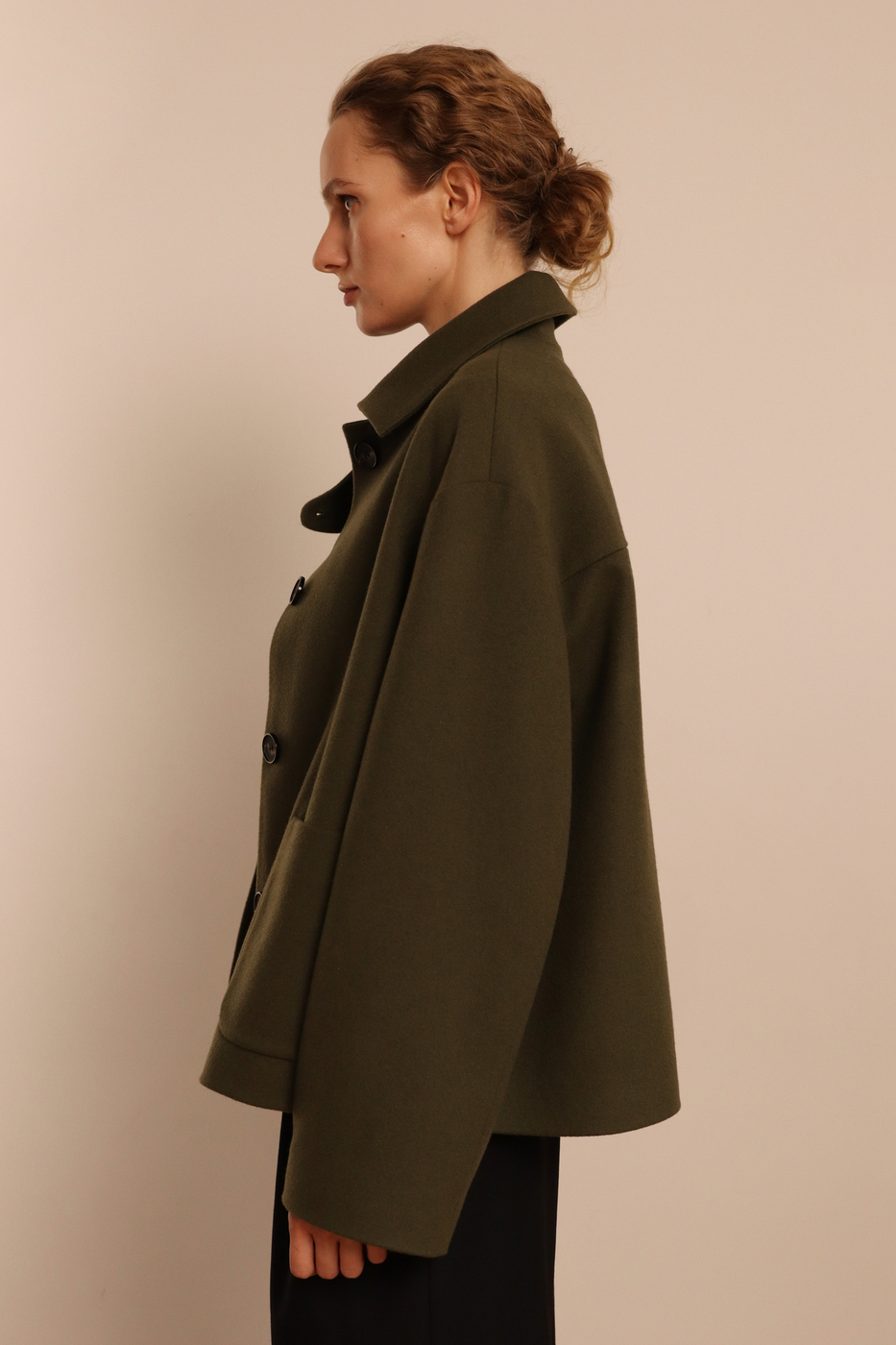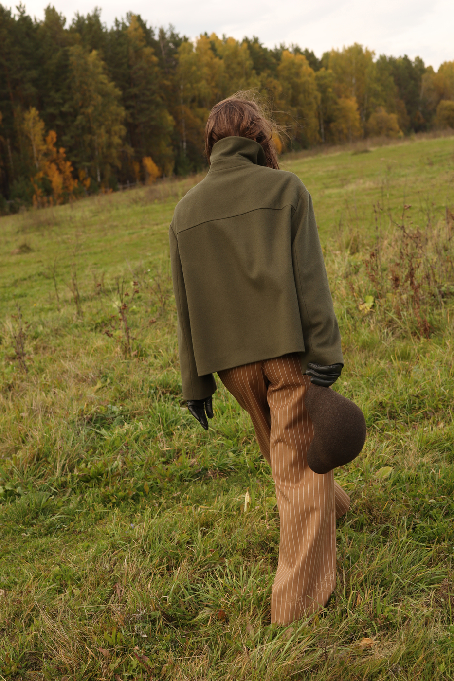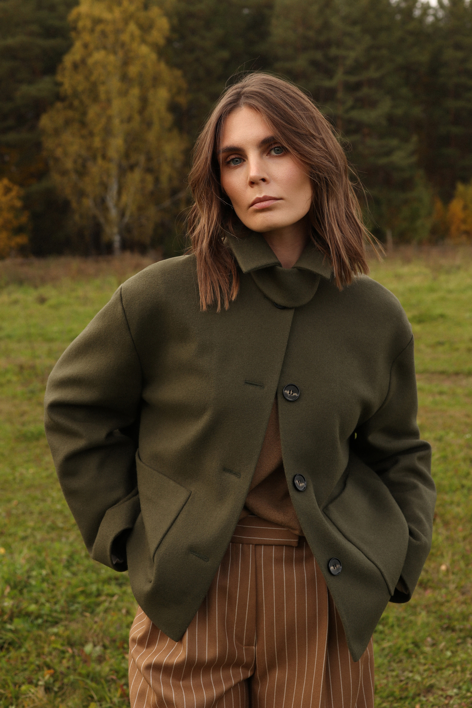 Укороченное пальто из итальянского шерстяного драпа от MaxMara — воплощение современного минимализма. Благородный оттенок приглушенного зелёного — один из ключевых цветов сезона: природный, глубокий и нейтральный, он органично сочетается с молочным, табачным, графитовым, бежевым. Это пальто легко впишется в базовый городской гардероб: