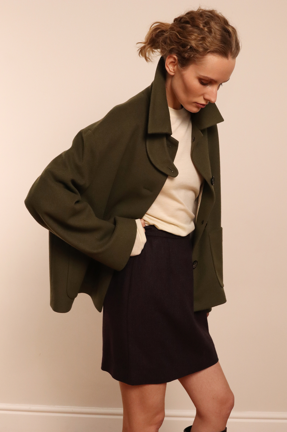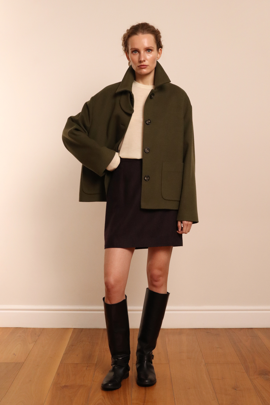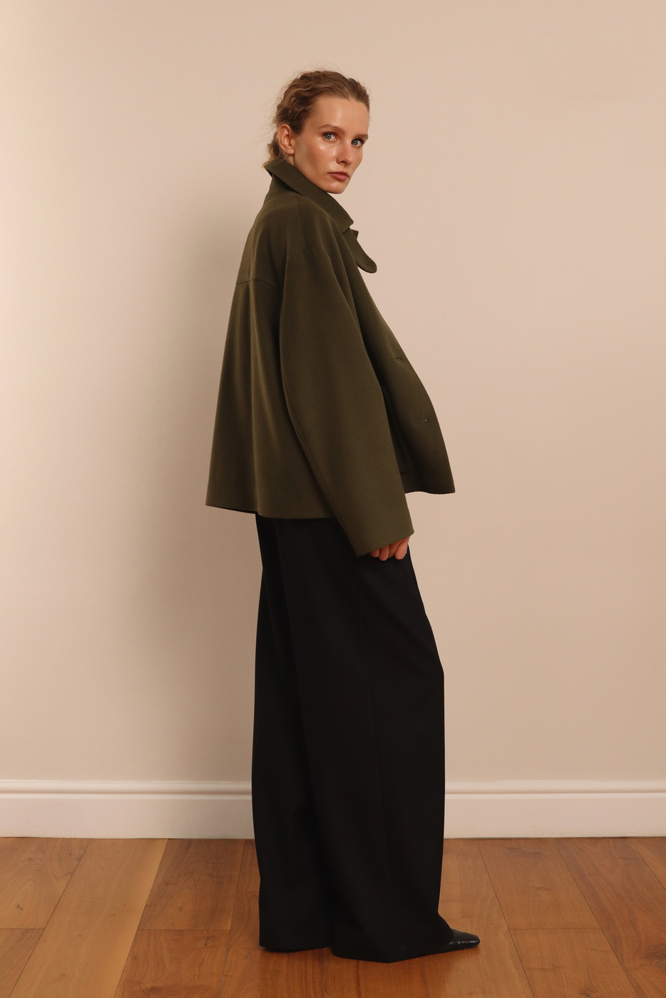 Укороченное пальто из итальянского шерстяного драпа от MaxMara — воплощение современного минимализма. Благородный оттенок приглушенного зелёного — один из ключевых цветов сезона: природный, глубокий и нейтральный, он органично сочетается с молочным, табачным, графитовым, бежевым. Это пальто легко впишется в базовый городской гардероб: