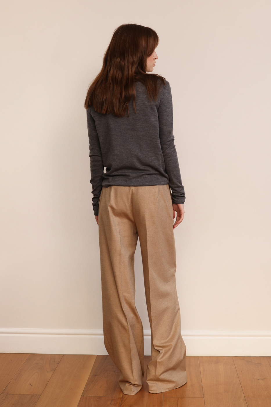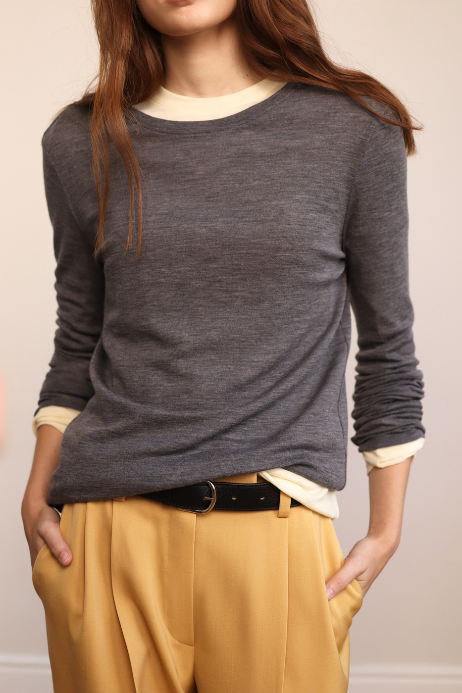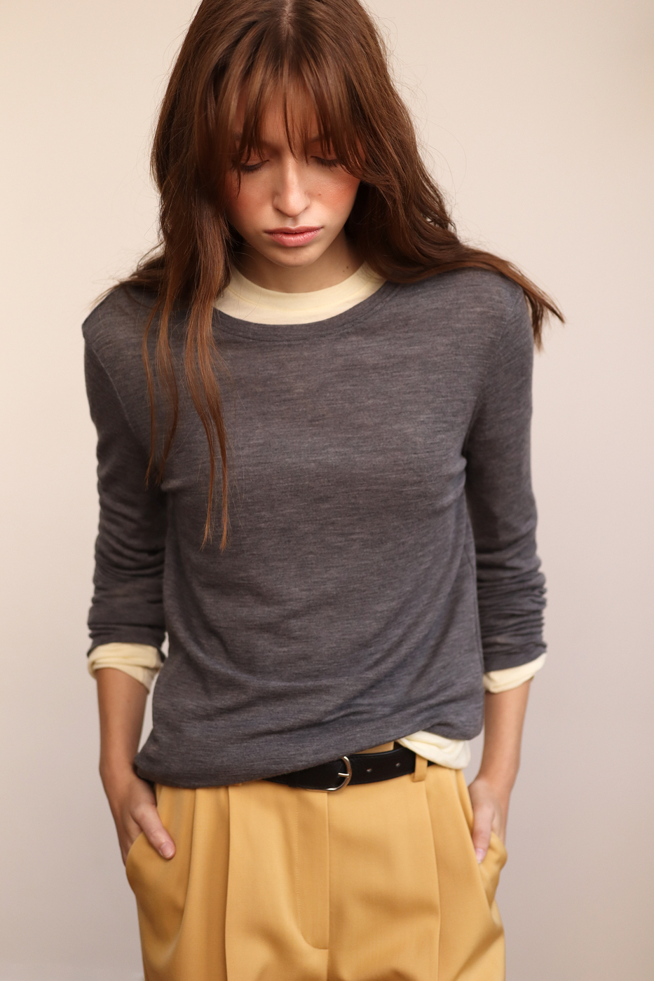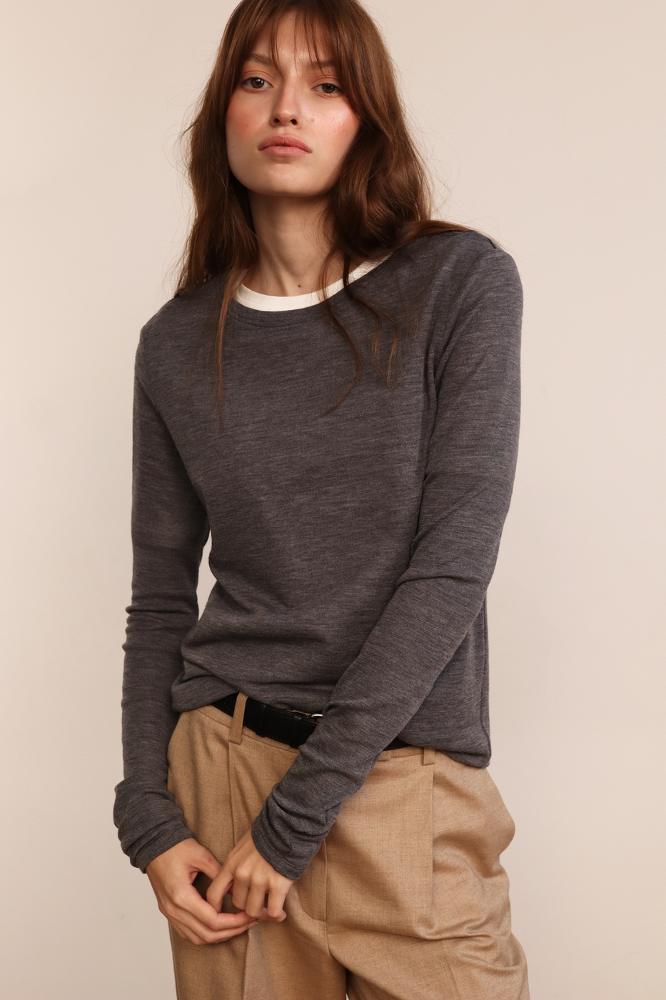 В основе этой модели — поиск баланса между функциональностью и чистой эстетикой. Мы выбрали исключительный по своим свойствам шерстяной трикотаж: он настолько тонкий и невесомый, что почти не ощущается на теле. Это идеальное решение для весеннего сезона, когда важен естественный термобаланс — в нем одинаково комфортно и в прохладном помещении, и в теплую погоду.